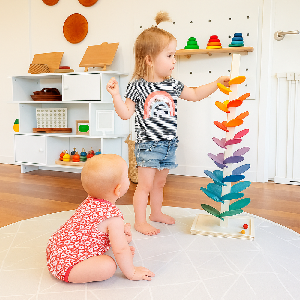 Say goodbye to endless scrolling and screen-time meltdowns. The Montessori Sound Tree keeps your child entertained through hands-on, mindful play. It’s fun, calming, and captivating — all without batteries or WiFi. Parents love the peace, and kids love the sound of marbles dancing down the colorful petals.